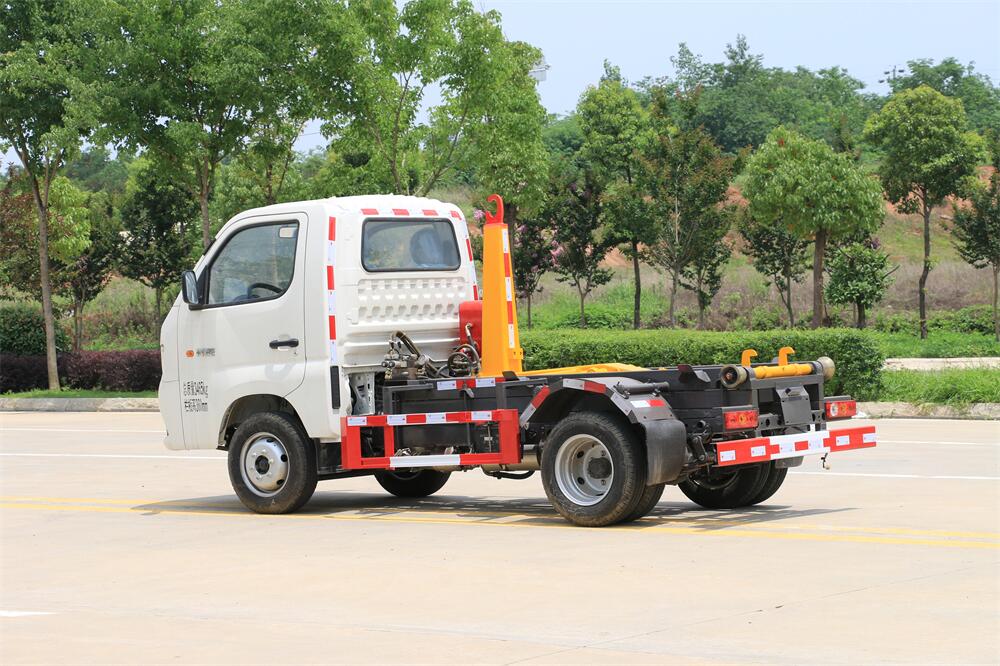 該款鉤臂式垃圾車由液壓系統、操作系統組成。舉升油制缸(1支)系國內知名液壓件廠家生產的雙作用油缸。垃圾廂可自吊上放下,可自行傾倒垃圾,上下一次工作循環時間≤50S。該車的特點是一個車能配多個垃圾廂,能實現一臺車與多個垃圾廂聯合作業,循環運輸,充分提高了車輛的運輸能力。